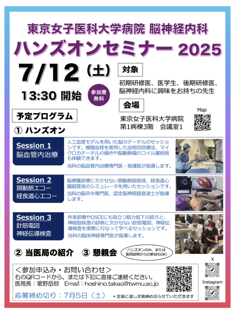 2025年4月23日 ハンズオンセミナーのお知らせ(7月12日) ハンズオンセミナーのお知らせです。 ★ハンズオンセミナー 📅7月12日(土)13時30分〜 ご参加希望の方は下記までご連絡ください! hoshino.takao@twmu.ac.jp neurology.cw@twmu.ac.jp